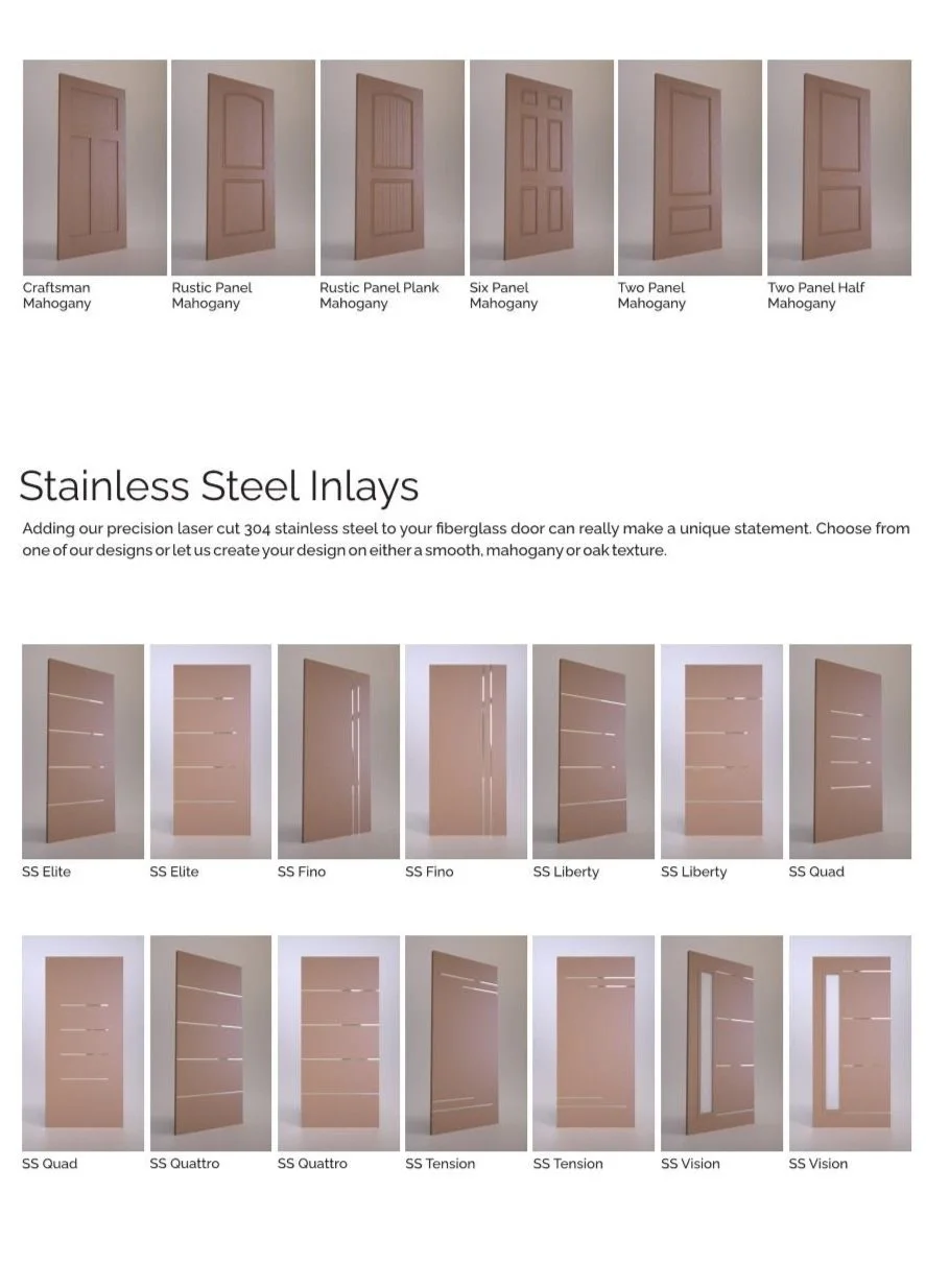 Collection of wooden doors and stainless steel inlays, showcasing various door styles and inlay designs in mahogany, oak, and stainless steel options.